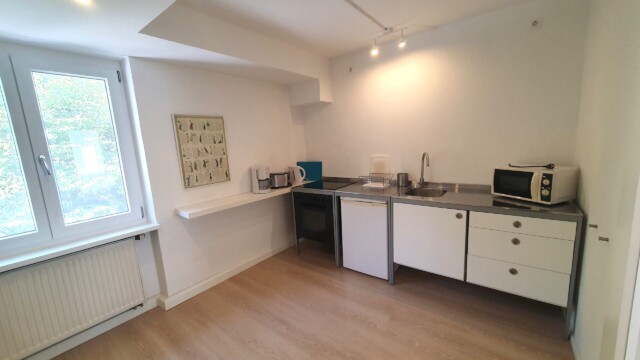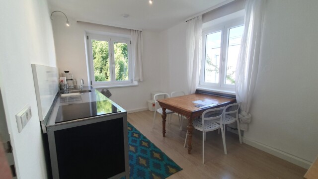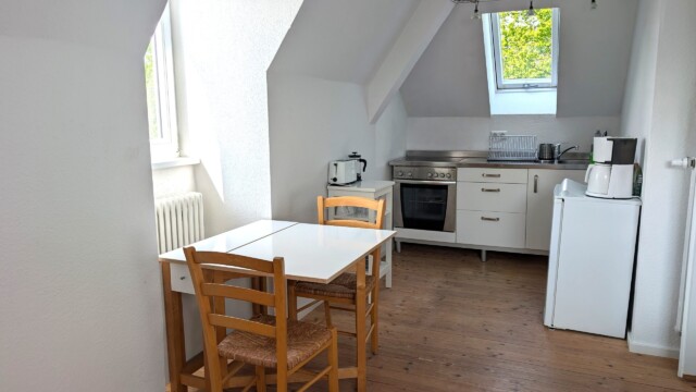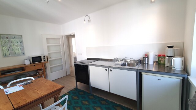 komplett ausgestattet, mit 4 Platten-Herd, Backoffen, Kühlschrank (ohne Eisfach), Kaffeemaschine, Wasserkocher und Esstisch für bis zu 4 Personen