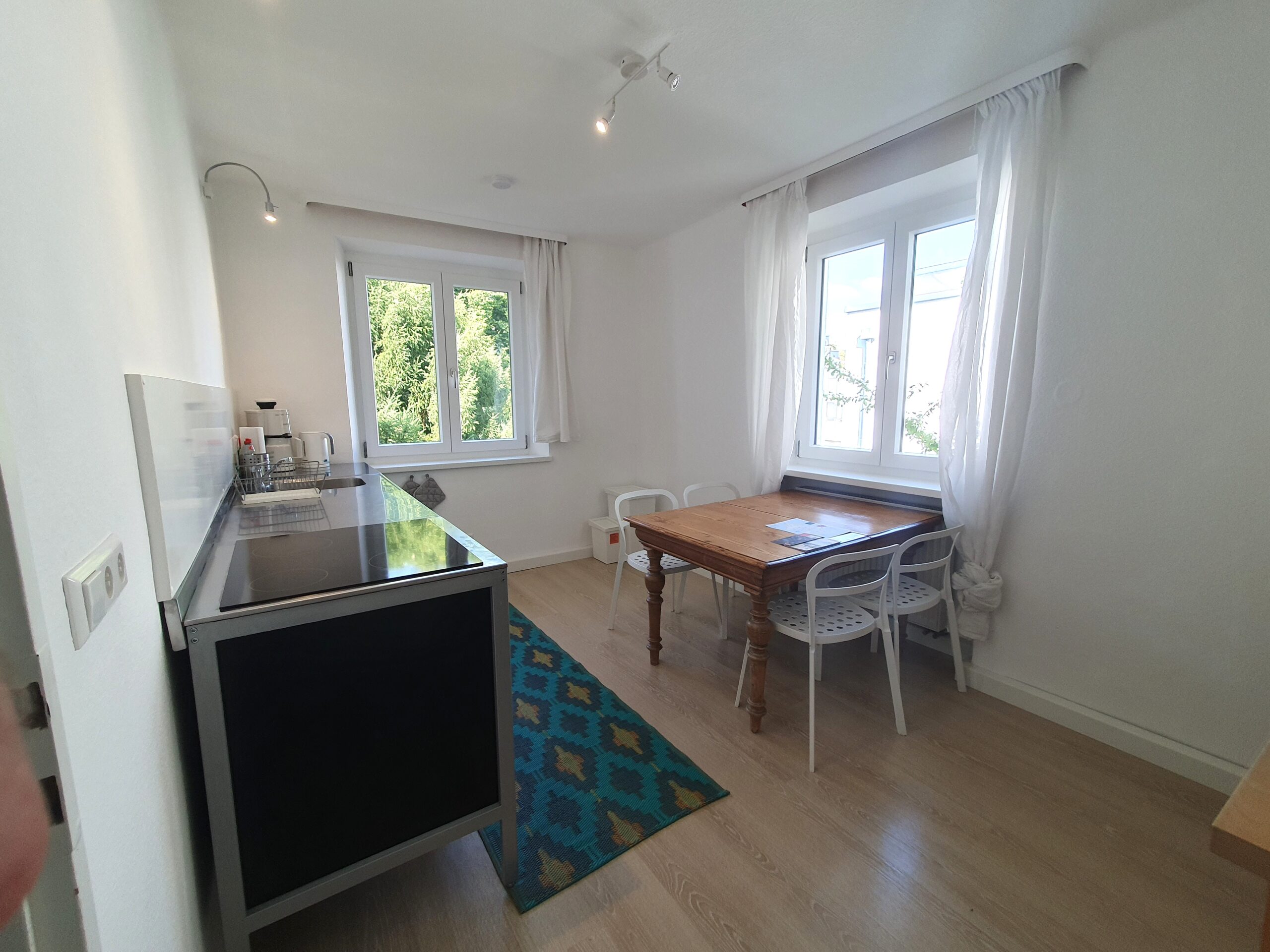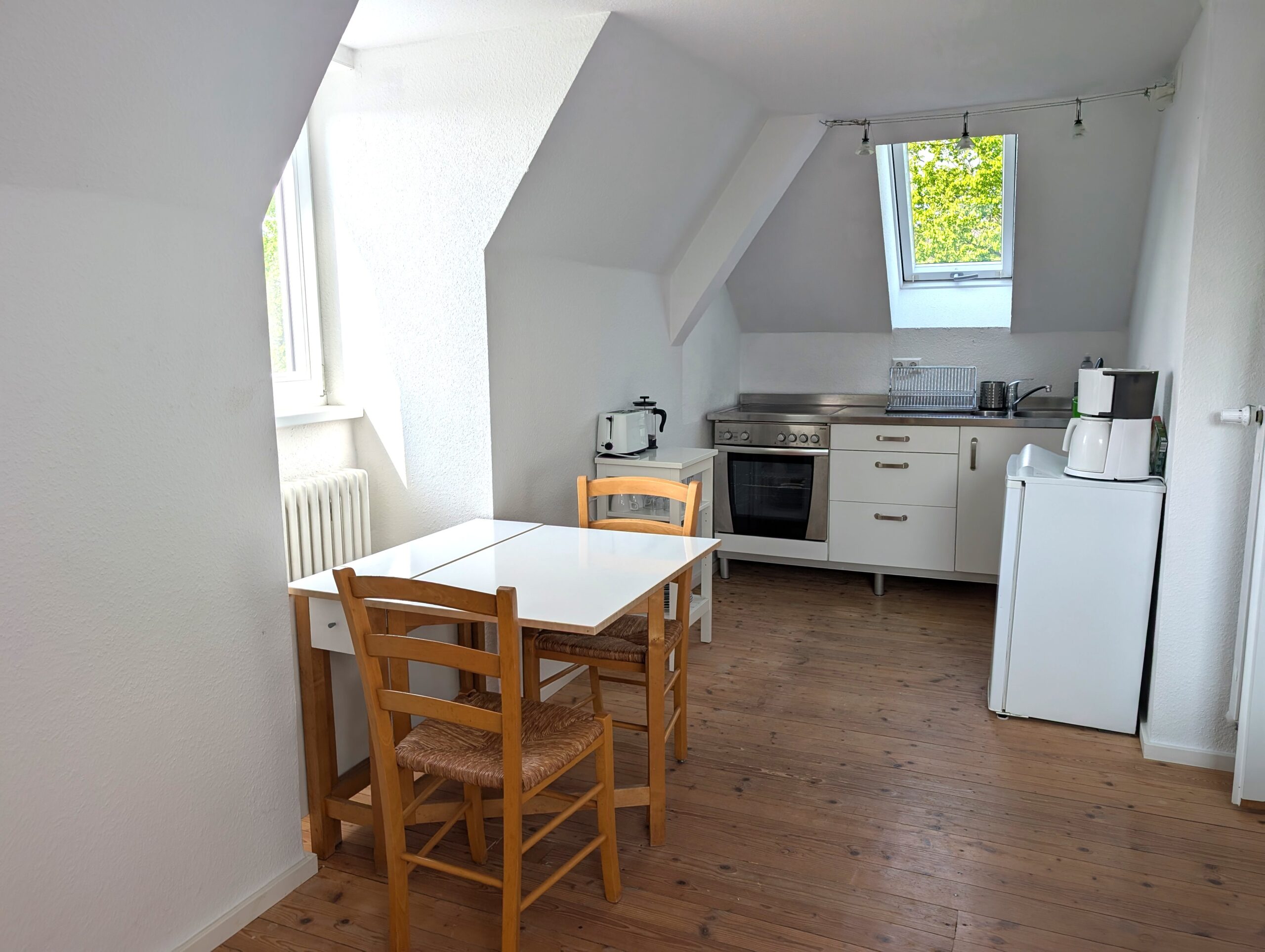 komplett ausgestattet, mit 4 Platten-Herd, Backoffen, Kühlschrank (ohne Eisfach), Kaffeemaschine, Wasserkocher und Esstisch für bis zu 4 Personen